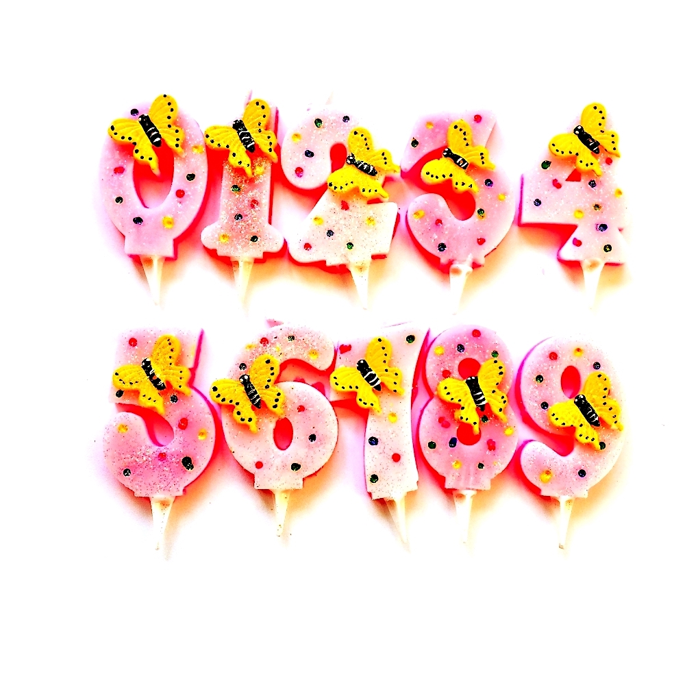 Свечи для торта, цифры розовые с бабочкой, блестящие. Для одноразового использования. Высота свечи 65 мм.