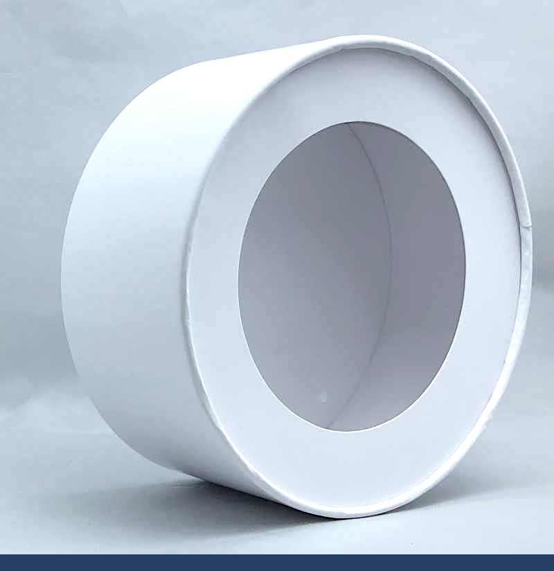 Размер: диаметр 145 мм, высота 60 мм. Картон: белый целлюлозный глянцевый. Окно - плёнка ПВХ. В упаковке 5-20 шт.